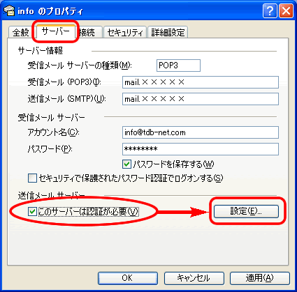 | 3. タブ「サーバー」をクリックします。 画面下部の「このサーバーには認証が必要」にチェックを入れて、 右横にある「設定」をクリックしてください。 |