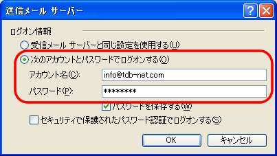 | 4. 「次のアカウントとパスワードでログオンする」を選択し、 アカウント名:お客様メールアカウント(@マーク以降も全て) パスワード:お客様パスワード を入力し、「OK」をクリックします。 |