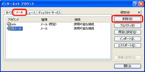 3. タブ「メール」をクリックします。削除したいアカウントを選択し、画面右の「削除」をクリックしてください。