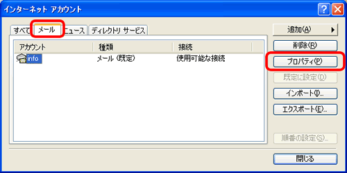 | 2. タブ「メール」をクリックします。 対象のアカウントにカーソルを合わせ、画面右側の「プロパティ」をクリックしてください。 |