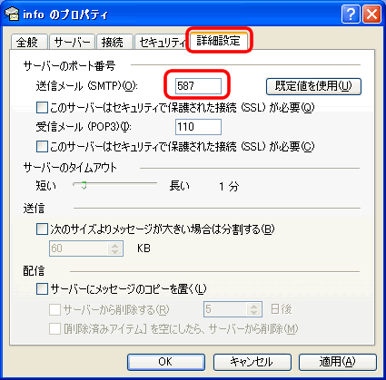 | 5. 「詳細設定」タブをクリックして「送信メール(SMTP)」を「25」から「587」へ変更して 「OK」をクリックして設定完了です。 |