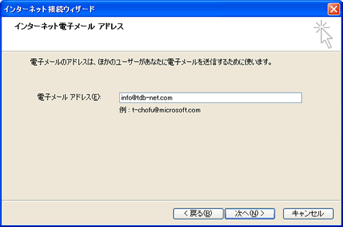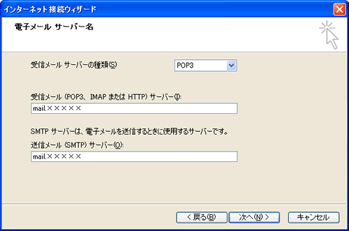 | 7. メールのサーバ情報を入力し「次へ」をクリックしてください。 受信メールサーバーの種類:POP3 受信メールサーバー:電子メールアカウント設定通知の「受信メールサーバ」の文字列です。 送信メールサーバー:電子メールアカウント設定通知の「送信メールサーバ」の文字列です。 |